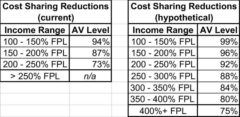 Now, one way I could see something like this working which would fall into the same general ballpark as Cassidy’s proposal would be to literally expand CSR assistance instead, from the current 150/200/250 levels out to something more like the following (this is pulled completely out of my ass, mind you, and it still wouldn’t help those over 400% FPL much):