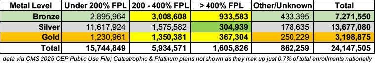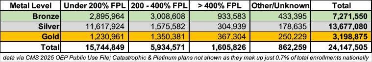 Here’s a breakout of current ACA exchange enrollment by metal level and income bracket...
